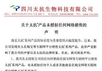 關(guān)于太抗?產(chǎn)品未授權(quán)任何網(wǎng)絡(luò)銷售的聲明發(fā)布日期:2017.05.15點擊量:6734 -