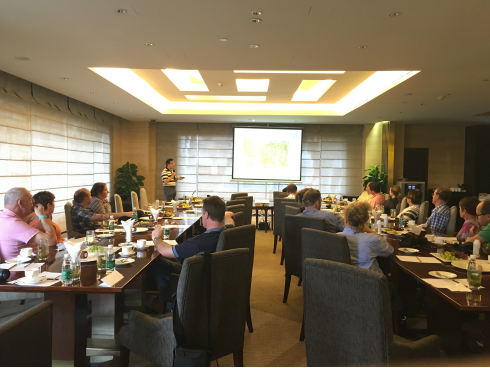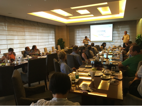 會上,董事長黃永博士詳細講解了太抗系列產(chǎn)品的作用機理及各地應用案列,得到了所有與會人員的高度關注。當講到太抗產(chǎn)品的安全性時,外賓們紛紛將在燒杯中的樣品看了又看,聞了又聞,可能實在覺得看似酸奶的生物農(nóng)藥著實稀奇。PPT放映結束后,外賓們接連提問,關于產(chǎn)品的保質(zhì)期、使用技術、投入產(chǎn)出比等等,董事長一一解答,連喝水的空都沒有。其中,來自來自維多利亞州的Gary Jeans講到其種植有4000公頃有機李用于出口中國,非常希望能用上太抗系列產(chǎn)品!此外,有外賓提出想帶些樣品回澳洲,也有外賓提出想和我公司澳洲研發(fā)人員深入交流,更有外賓要了黃董厚厚一疊名片說是要去澳洲幫我們做宣傳!