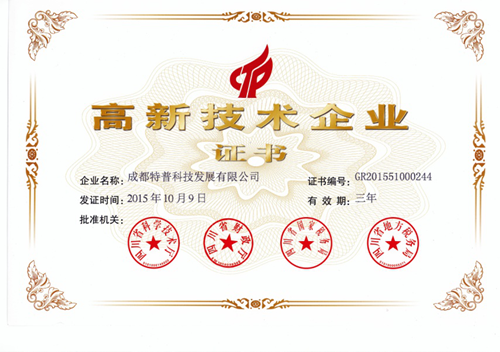 今年下半年,經(jīng)企業(yè)申報(bào)、專家評(píng)審、公示等程序,成都特普科技發(fā)展有限公司取得由四川省科學(xué)技術(shù)廳、四川省財(cái)政廳、四川省國家稅務(wù)局、四川省地方稅務(wù)局共同頒發(fā)的高新技術(shù)企業(yè)證書,證書編號(hào):GR201551000244,發(fā)證時(shí)間2015年10月9日,有效期:三年。