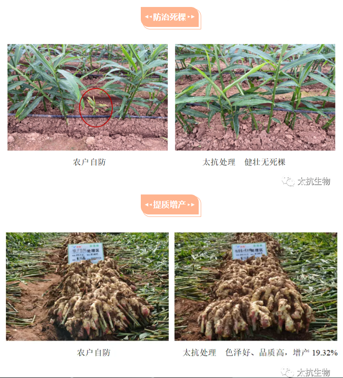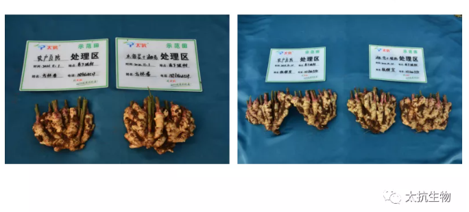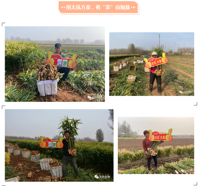 自2016年至今,太抗?產品一直深耕于大姜的各主產區(qū),并且在防病增產、解決大姜的土傳病害上屢立戰(zhàn)功。今年“姜”山如故,太抗?產品依舊光彩熠熠,我們來看一下示范效果吧: