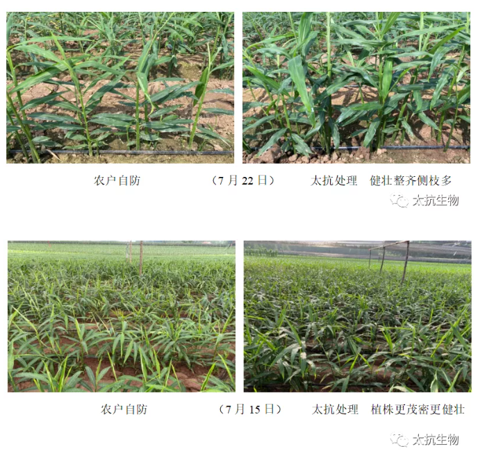 綜上所述,使用太抗?產品讓大姜長勢健壯整齊,側枝多且壯,防治死棵,提質增產增收,并且太抗?產品在有機種植以及原原種生產中也取得不錯的成績,助力生產,我們一直在努力!