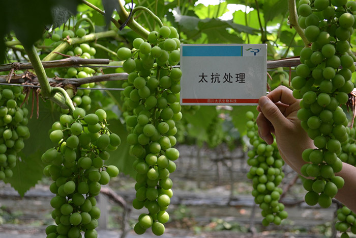 莊園牧歌陳總對(duì)太抗系列產(chǎn)品的效果給予了充分肯定:第一、與進(jìn)口化學(xué)殺菌劑效果相當(dāng);第二、性價(jià)比高,藥效持效期長(zhǎng);第三、植株長(zhǎng)勢(shì)健壯、葉片濃綠厚實(shí);第四、促進(jìn)葡萄生長(zhǎng),提前著色,可以使葡萄提早上市。陳總說“我們國人自己生產(chǎn)的太抗生物農(nóng)藥既然有這么好的效果,性價(jià)比高,又安全,我肯定支持國產(chǎn)噻”,這是對(duì)我們太抗最大的肯定與鼓舞!
